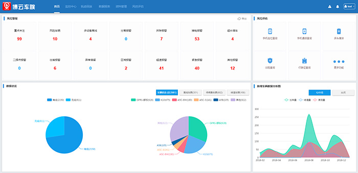 云平台整体业务:首页、监控**、轨迹回放、数据报表、资料管理、风控评估。
