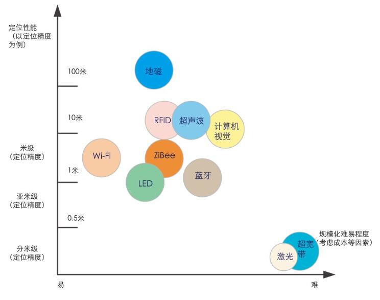 室内定位的技术分支多样,下图是各种室内定位方案的对比图: