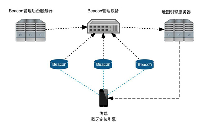 终端侧定位系统由终端设备(如嵌入SDK软件包的手机)和beacon组成。其具体定位原理是: