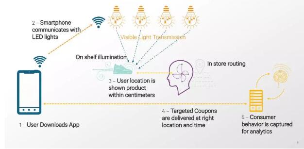 目前,可见光技术在北美有很多商场已经在部署。用户下载应用后,到达商场里的某一个货架,通过**货架周围的灯光即可知晓具体位置,商家在通过这样的方法向消费者推动商品的折扣等信息。